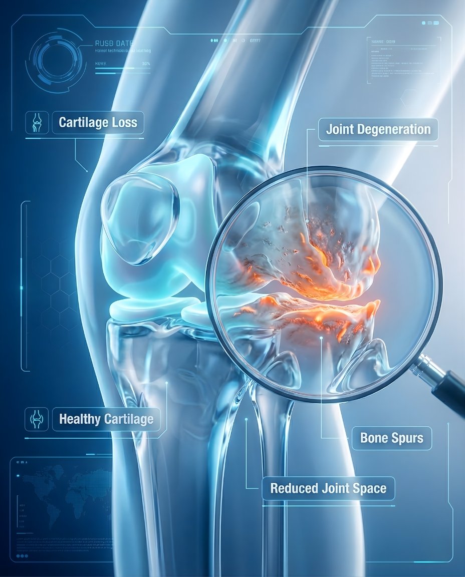 Osteoarthritis (OA) is a chronic degenerative joint disease in which cartilage and other tissues within the joint gradually break down over time. In short, clinically, what is osteoarthritis? It is a whole-joint disorder involving cartilage loss, bony change, joint lining irritation, and altered joint mechanics that can cause pain, stiffness, swelling, and reduced function.