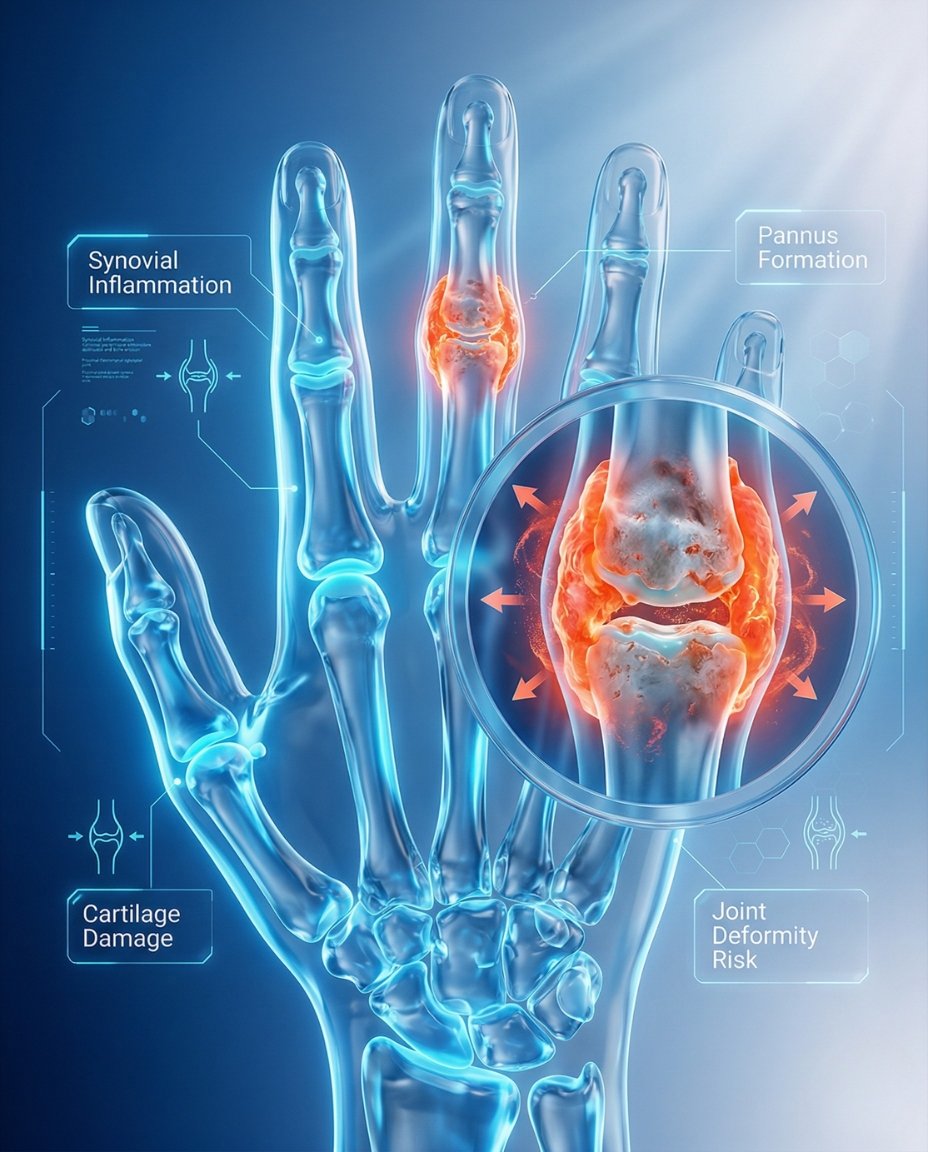 In RA, persistent immune activation drives chronic synovitis. The inflamed synovial tissue can invade nearby cartilage and bone, leading to erosions and structural damage over time. This is why early anti-inflammatory disease control is so important, even when symptoms still seem “mild.”